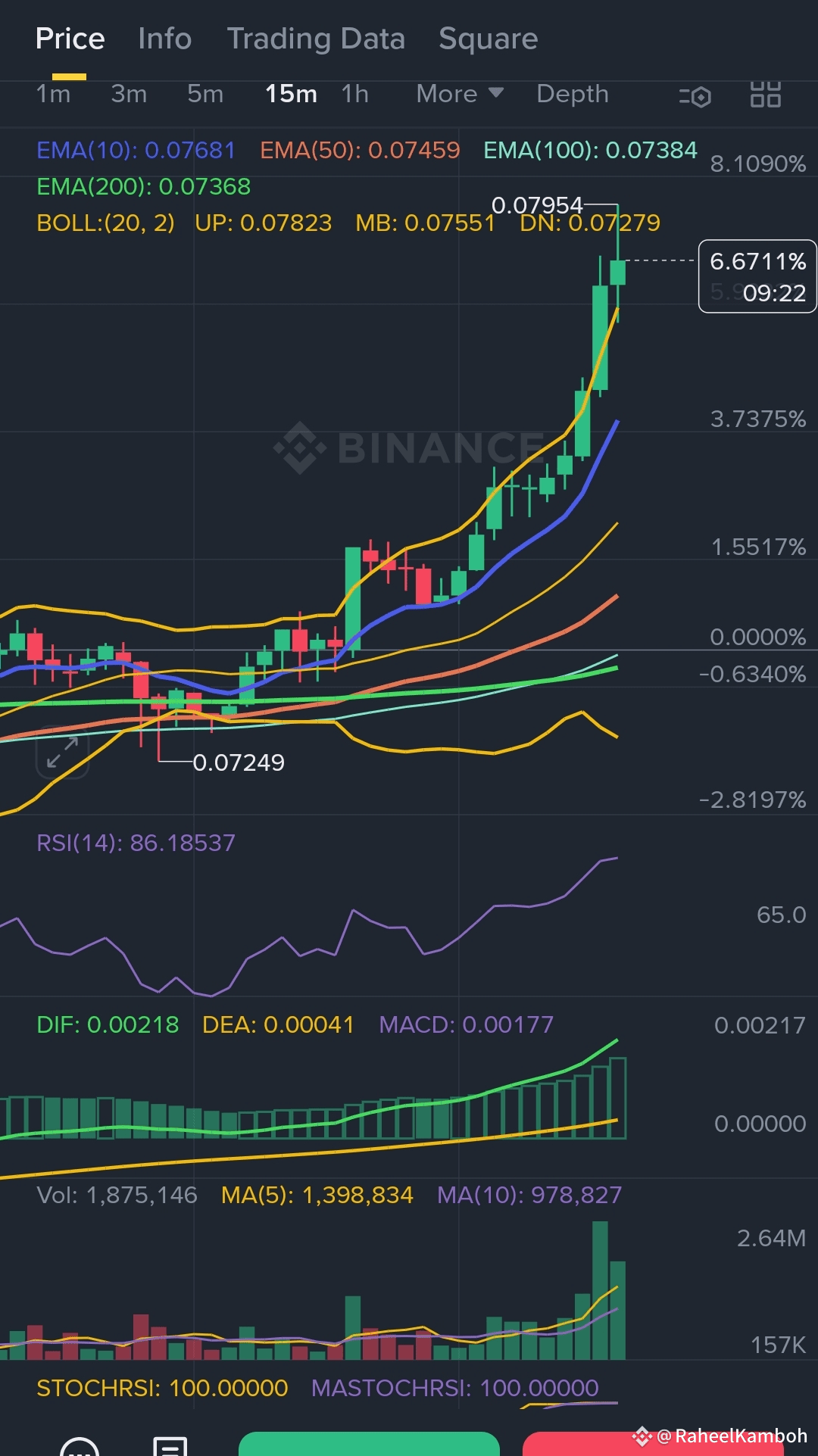 - **0.07878** (+9.58%), **BREACHING UPPER BOLLINGER BAND** (0.07823) → **MAX STRETCH!**