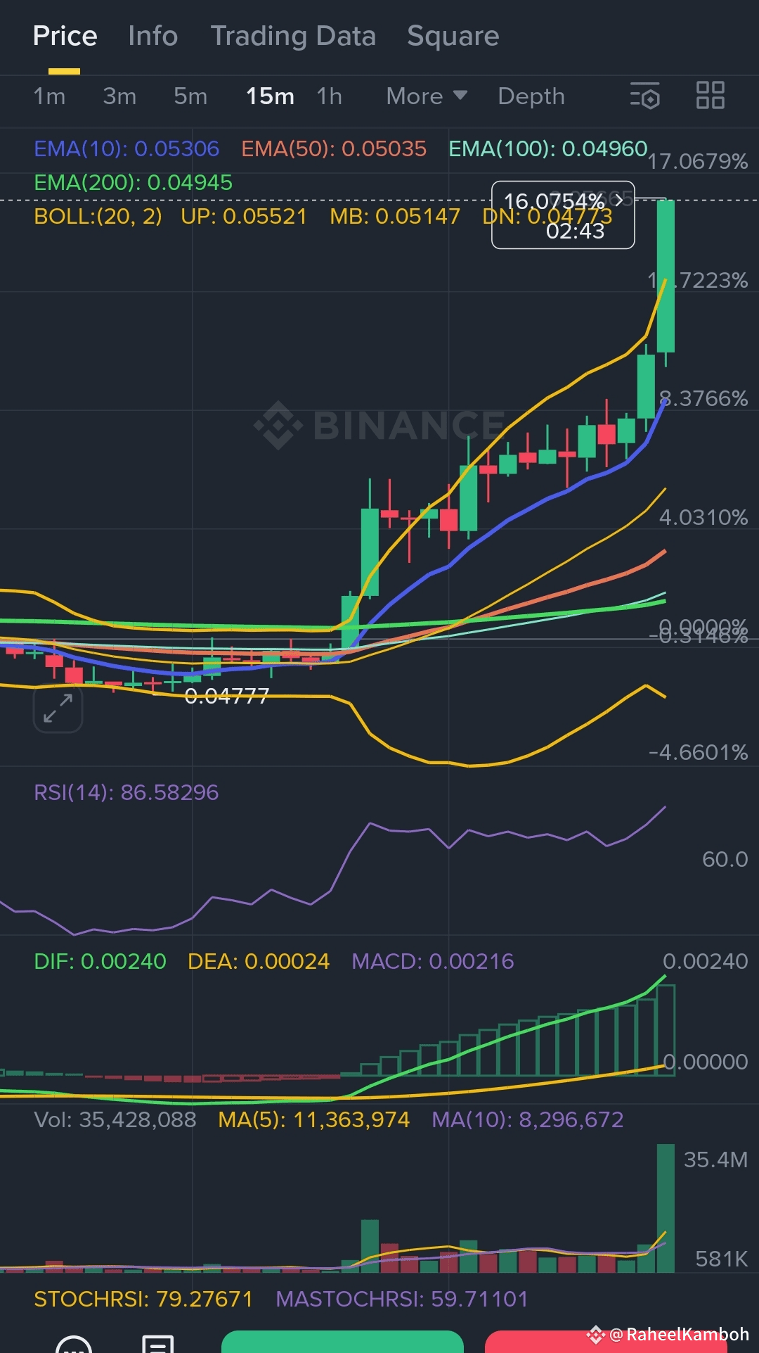 - **0.05661** (+20.47%), **VIOLATING UPPER BOLLINGER BAND** (0.05521) → **MAX STRETCH!**