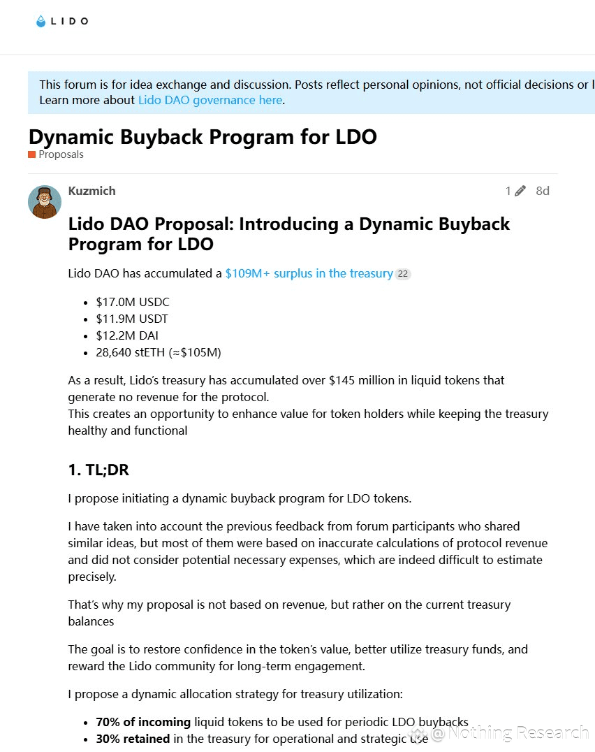 Lido 作为目前最大的 LST 协议,国库里有 1.6 亿美金 $ETH 和稳定币,所以最近社区连续提了几个提案来讨论是不是应该启动回购。