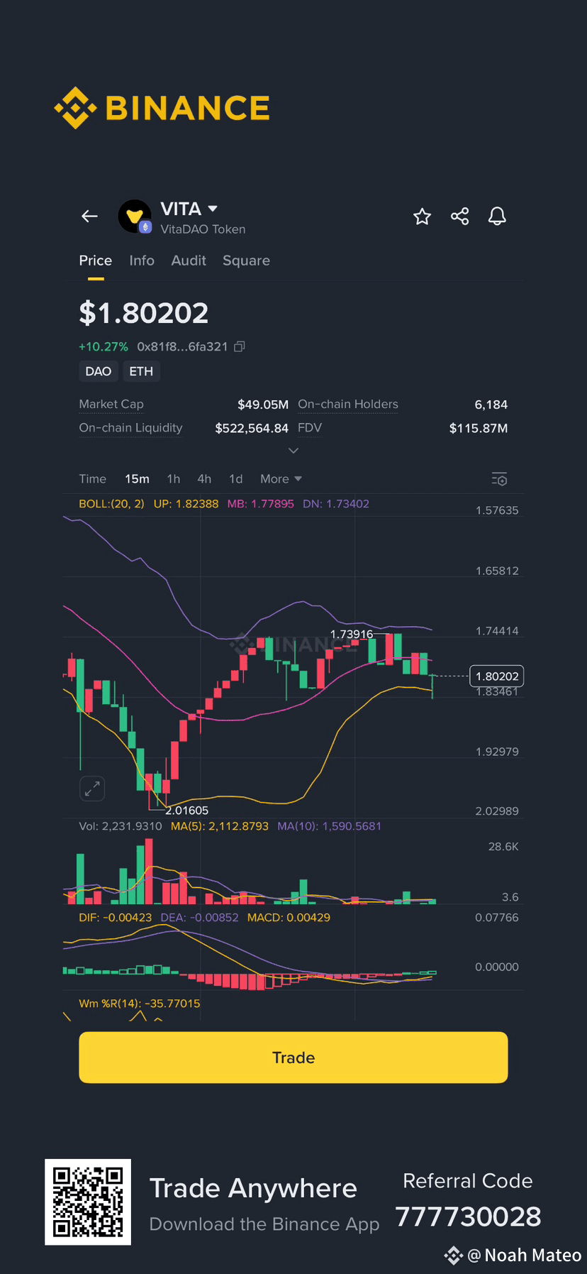The provided chart from Binance paints a bullish picture for VITA's recent performance. With a current price of $1.80202, the token has seen a significant daily increase of +10.27%. This positive price action is a strong indicator of growing market confidence and increased investor interest. The price chart shows VITA consolidating its gains and testing new resistance levels, suggesting that a continued upward trend may be on the horizon.