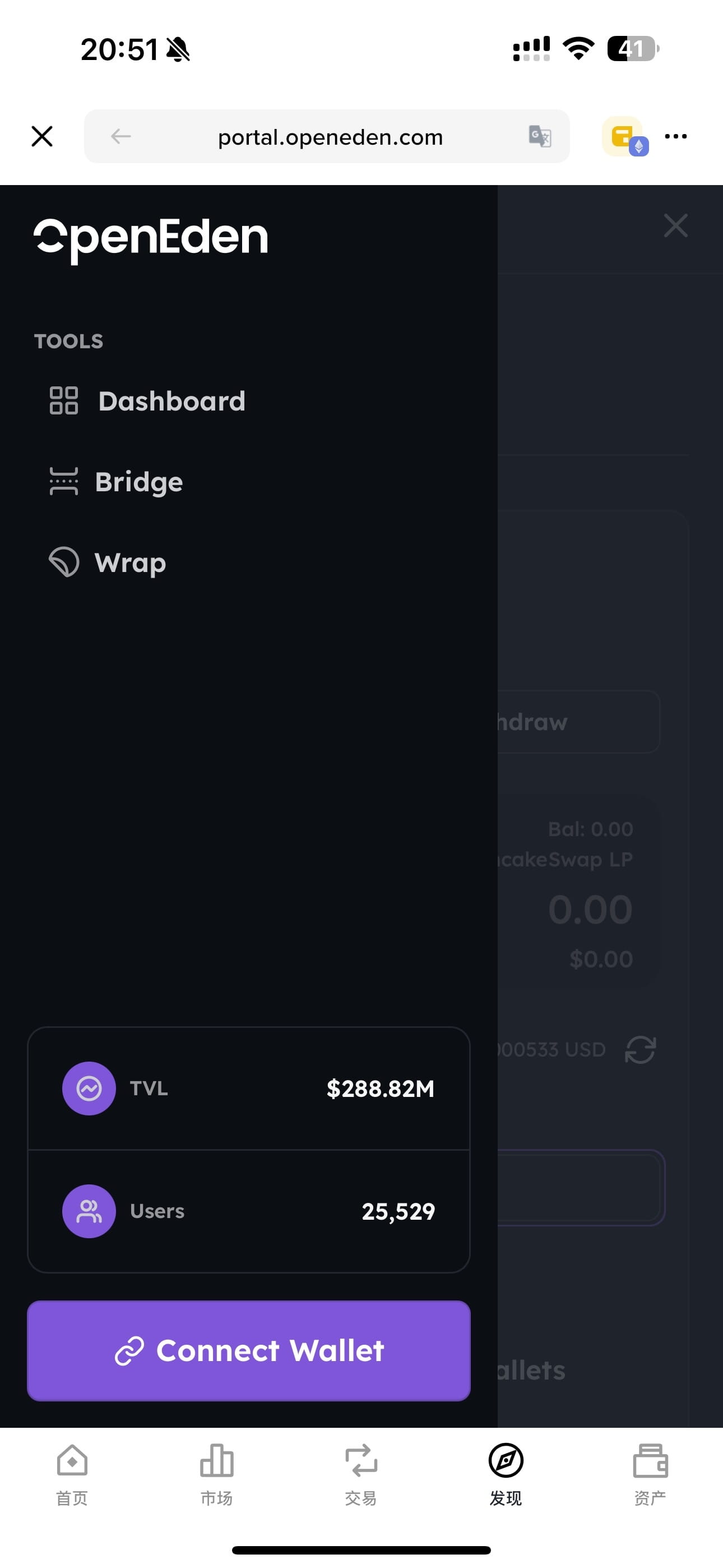 4) 回到OpenEden主页面,点击如下图 2 位置按钮,会跳转PancakeSwap。