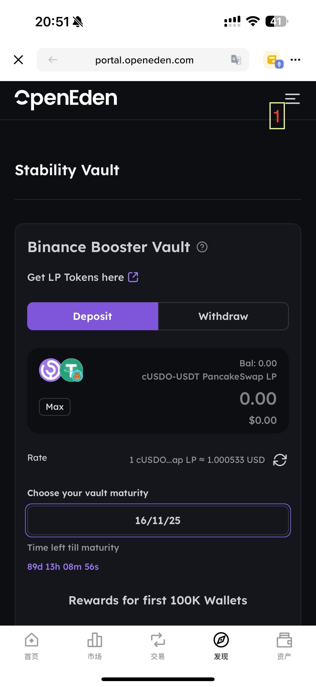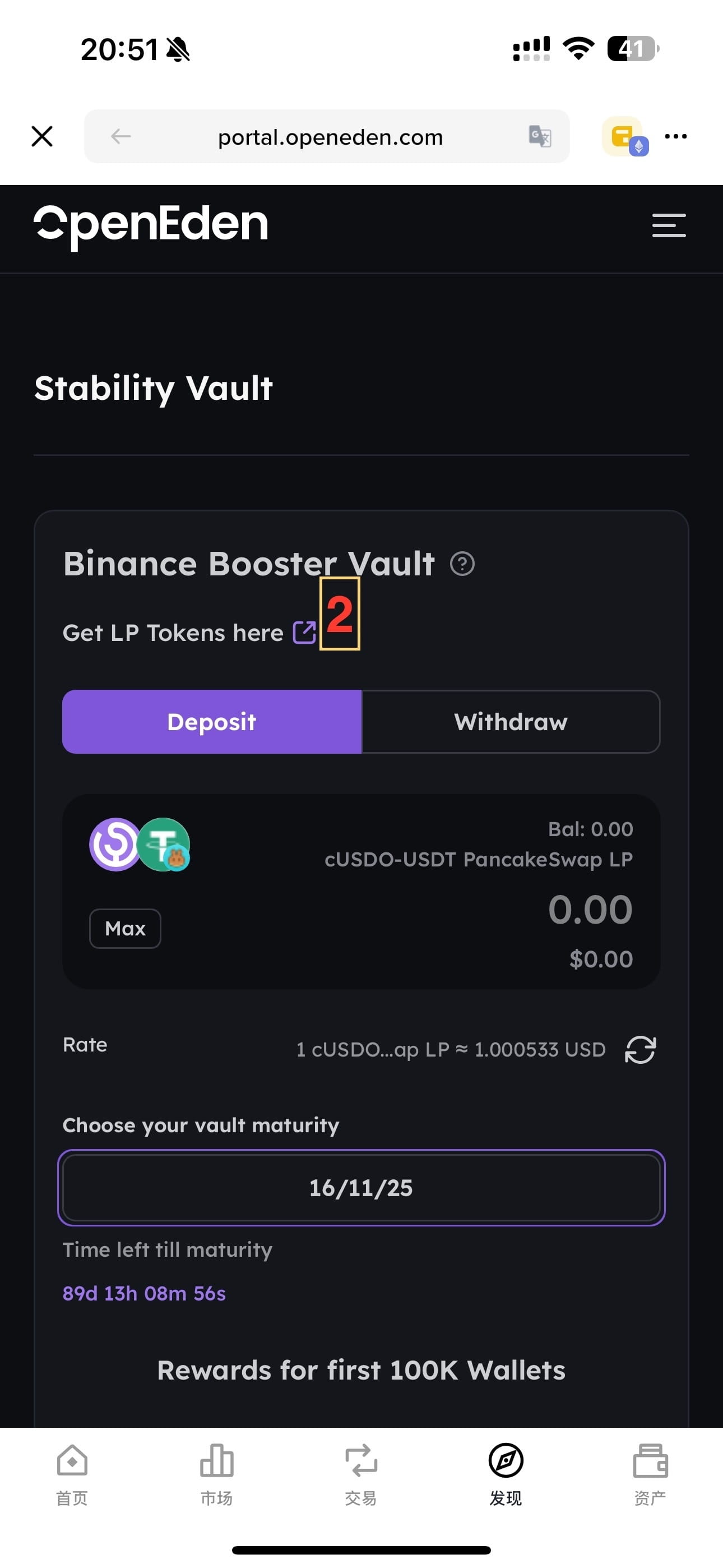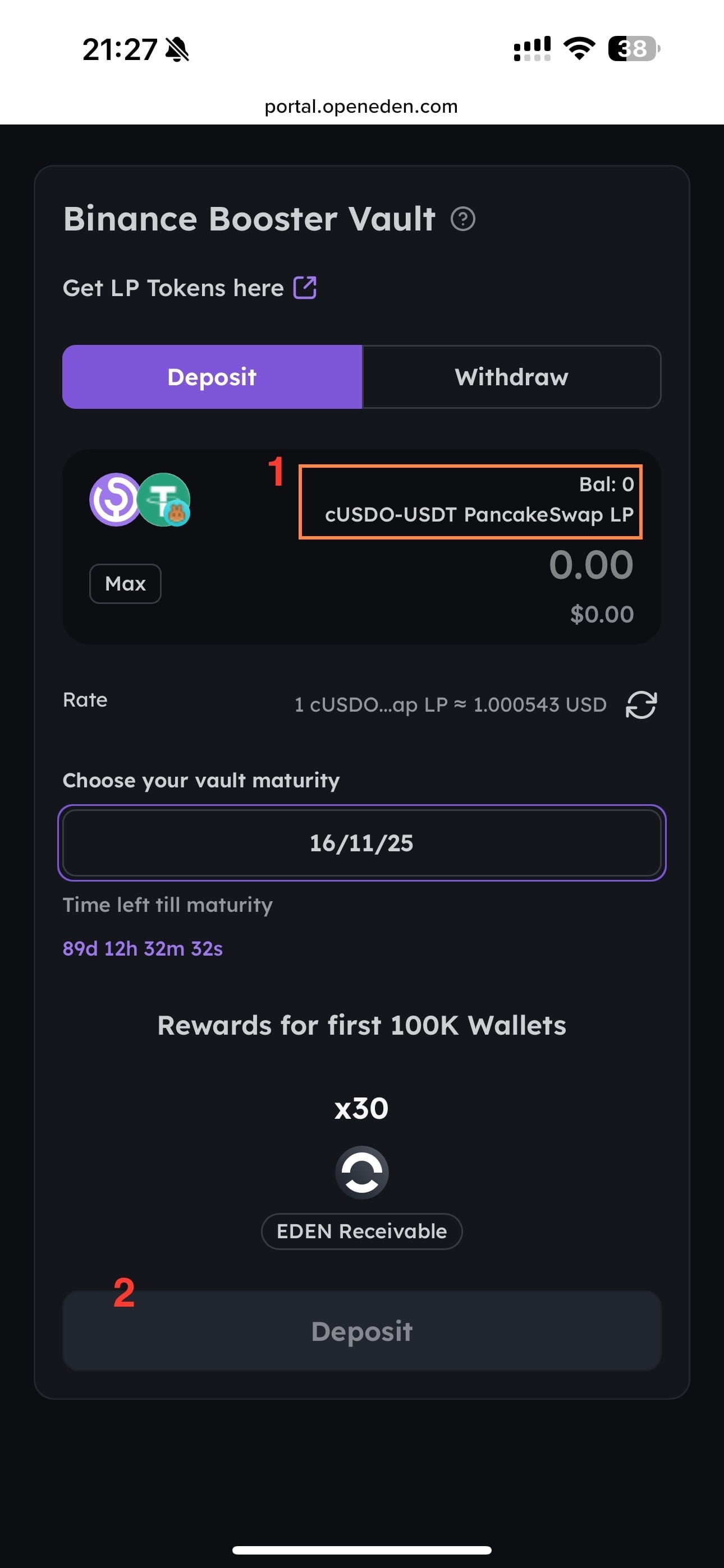 7) 上一步流动性添加完成后,再回到OpenEden的页面(可以从任务页面再次进入),此时在下图 1 的位置应该可以看到自己 cUSDO-USDT 币对的 LP 资产。点击 Max 按钮,然后点击下方标记 2 的 Deposit 按钮,进行 LP 资产的质押。这里同样需要确保LP资产的金额 > 50u。如果不够的话,回到上一步添加足够的LP。