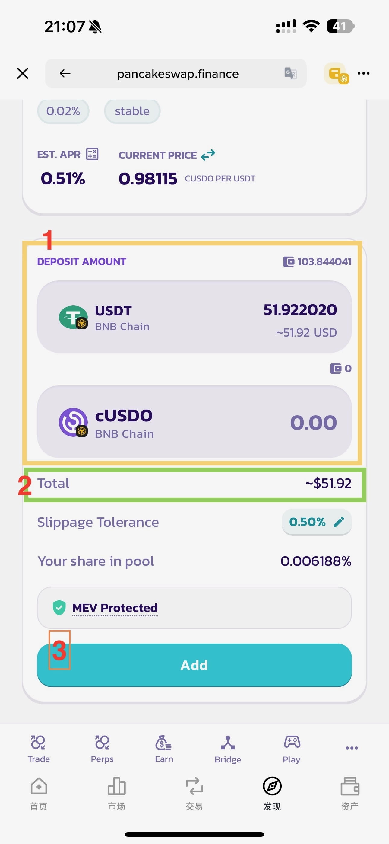6) 连上钱包之后,在下图标记 1 的 黄色方框中,两个小钱包的位置会显示出你钱包中 USDT 和 cUSDO 的数量。这里可以把第三个任务中兑换的 cUSDO 全部加进去再加一些USDT,或者全部用USDT都行,但一定要保证标记 2 的绿色方框内的总金额 > 50U。PancakeSwap 第一次添加某Token流动性的时候需要对该币种进行授权,所以 3 处的按钮会先显示授权。USDT和cUSDO都授权之后,再点击按钮就是正式添加流动性了。流动性添加成功后,在币安钱包资产页面的NFT tab中会多一个NFT作为你添加的流动性的证明,同时在 DeFi tab中会显示你的LP资产(不过会有点延迟,流动性添加需要一点时间)。