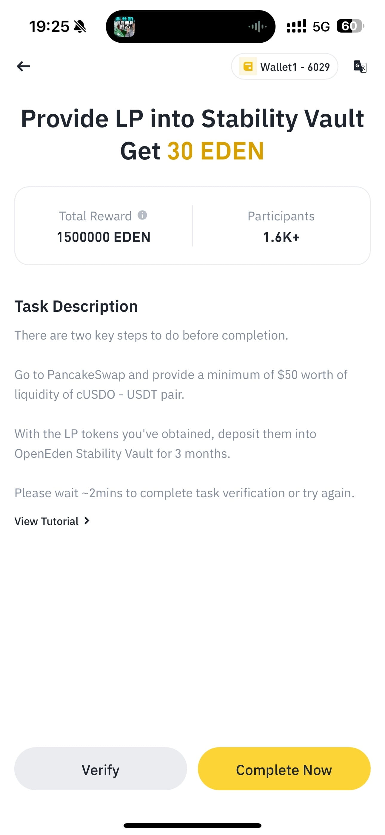 这次任务需要在钱包里有至少 50 usdt 和 200 usdc,我都稍微留多了一点,60 usdt 和 210 usdc;磨损主要是各种gas,兑换cUSDO的gas、存LP的gas、授权的gas、质押到eden vault的gas,加起来其实也没多少。最最最需要关注的是,LP 质押最短3个月,也就是说至少 250个u 要锁定 3个月的期限。重要的事情说三遍:3个月!3个月!3个月!