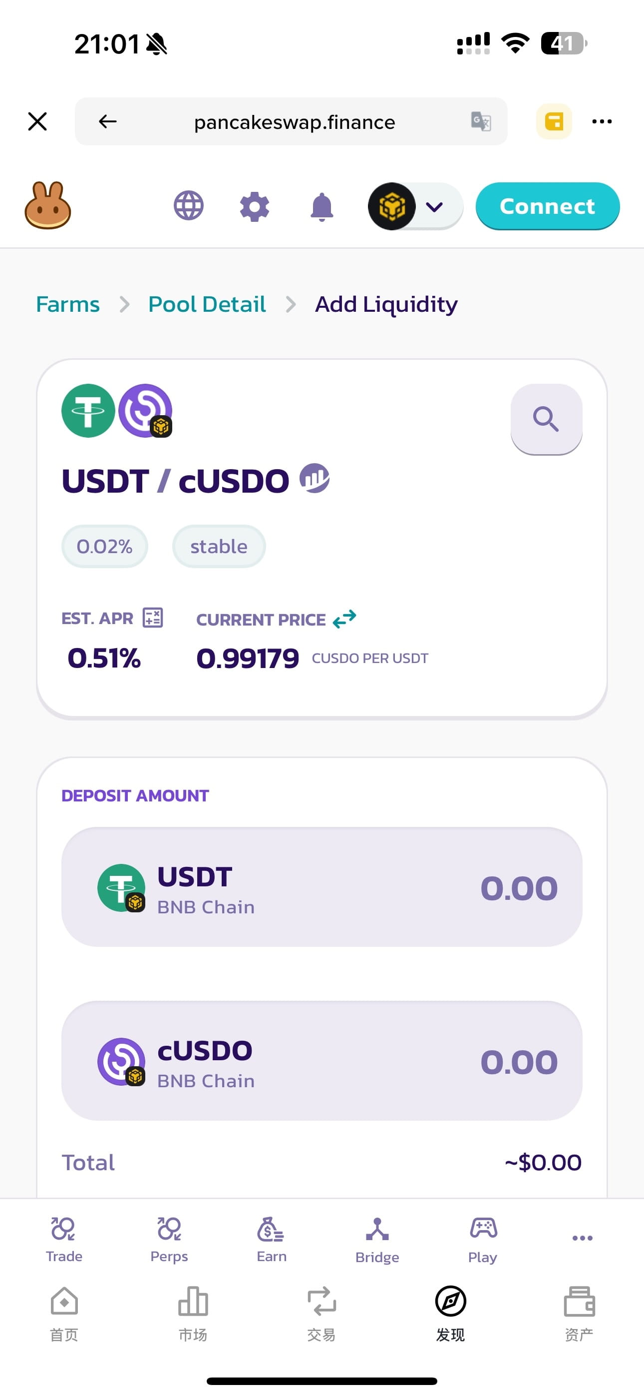 5) 在PancakeSwap页面点击右上角的Connect,连接币安钱包