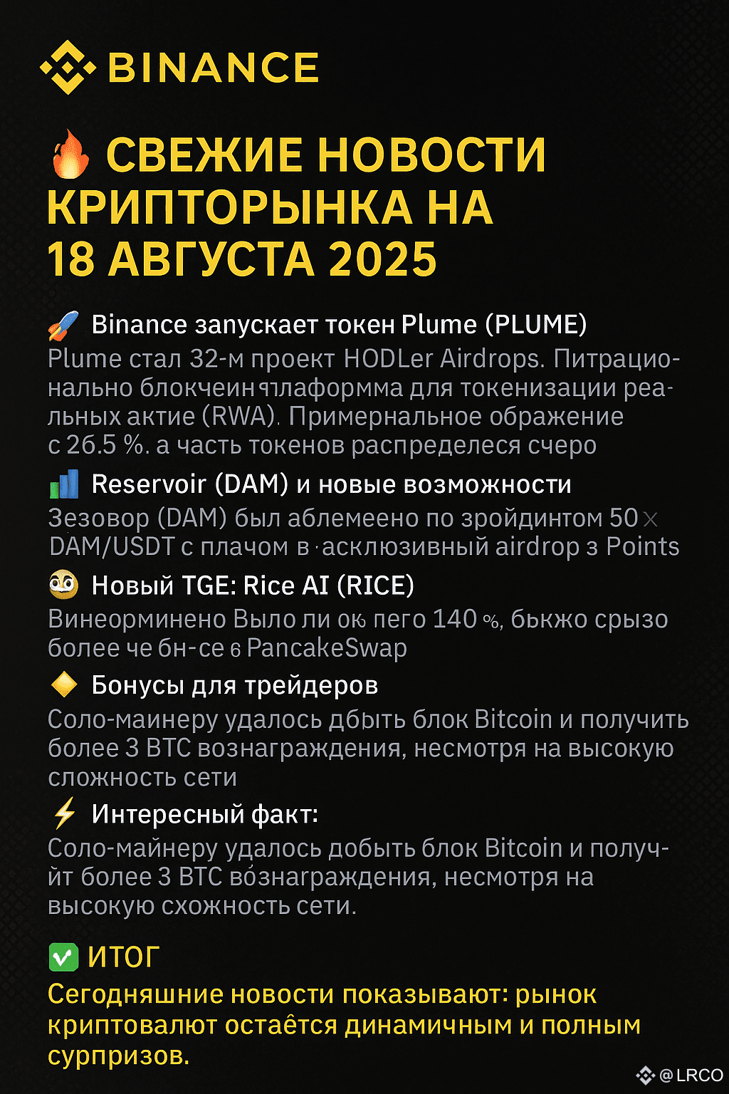 Сегодняшние новости показывают: рынок криптовалют остаётся динамичным и полным сюрпризов. Новые проекты, такие как PLUME, DAM и RICE, открывают свежие возможности для инвесторов, а акции Binance делают торговлю ещё выгоднее. Несмотря на коррекцию по основным монетам, DeFi-сектор продолжает демонстрировать силу и уверенный рост.