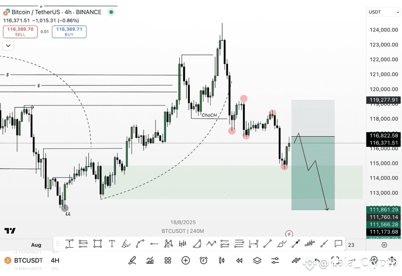 Now price is retesting supply – if it holds, we could see a drop toward the 113k demand zone.