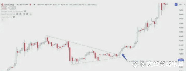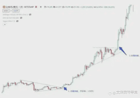 来到下图箭头所在位置的K线,我们可以看到,经过一段中长期的震荡,比特币走出了一个收敛三角形的结构。在这个位置,一根大阳线向上突破了上方的下降趋势线,给我们发出了一个多头信号