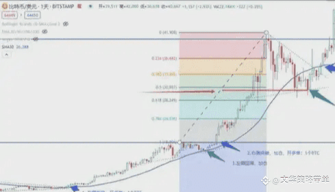 3、(图一)回顾一下我们的前两次入场,假设此时我们的K线已经演变到出现较大回调前的位置,价格约为40518。此时我们可以看到,在点位2的这笔浮盈加仓 (滚仓)涨幅为101%