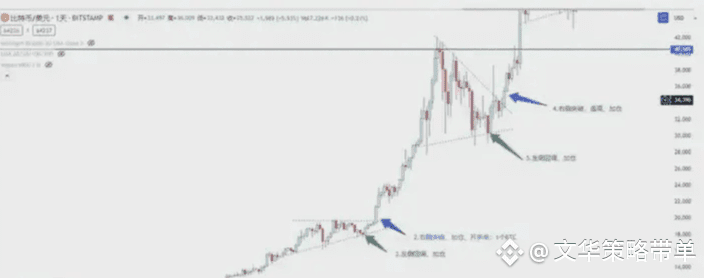 (图四)需要注意的是,箭头3的位置属于相对左侧交易。左侧交易风险更大,但入场的盈亏比更优。相对于第一笔仓位,第二笔仓位是浮盈加仓 (也称为滚仓)。可以看到,接下来行情经历了一段强势的上升趋势,到2021年1月,比特币的价格大概来到了4万美元,然后出现了一个较大的回撤,并再次走出了一个收敛三角形的结构