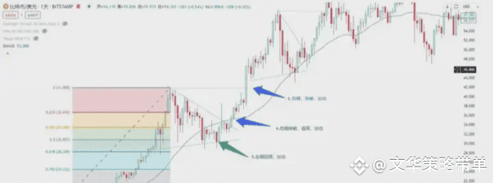 再如,在箭头5的位置,如果我们打开上一段上升趋势的斐波那契回调,我们可以看到5的位置蜡烛图的低点基本上回调到了上一段上升趋势的0.5水平。这意味着,一旦上升趋势成立,次级回调到0.5甚至极限的0.618,都是非常重要的位置。在此处收出阳线之后,箭头5的位置也可以作为一个适合滚仓的位置。