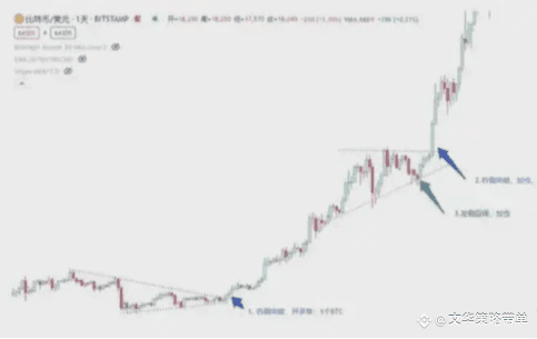 (图三)在这个位置,正是肥宅定义中的恰当时机,也就是滚仓的时机,位于箭头2所指的地方。如果我们在这个位置进行右侧追突破,开了一个BTC的多单,可以看到比特币在几次中长期震荡后,通过一根大阳线突破了前高。这个位置符合肥宅交易的三板斧:右侧交易、追突破、浮盈加仓。