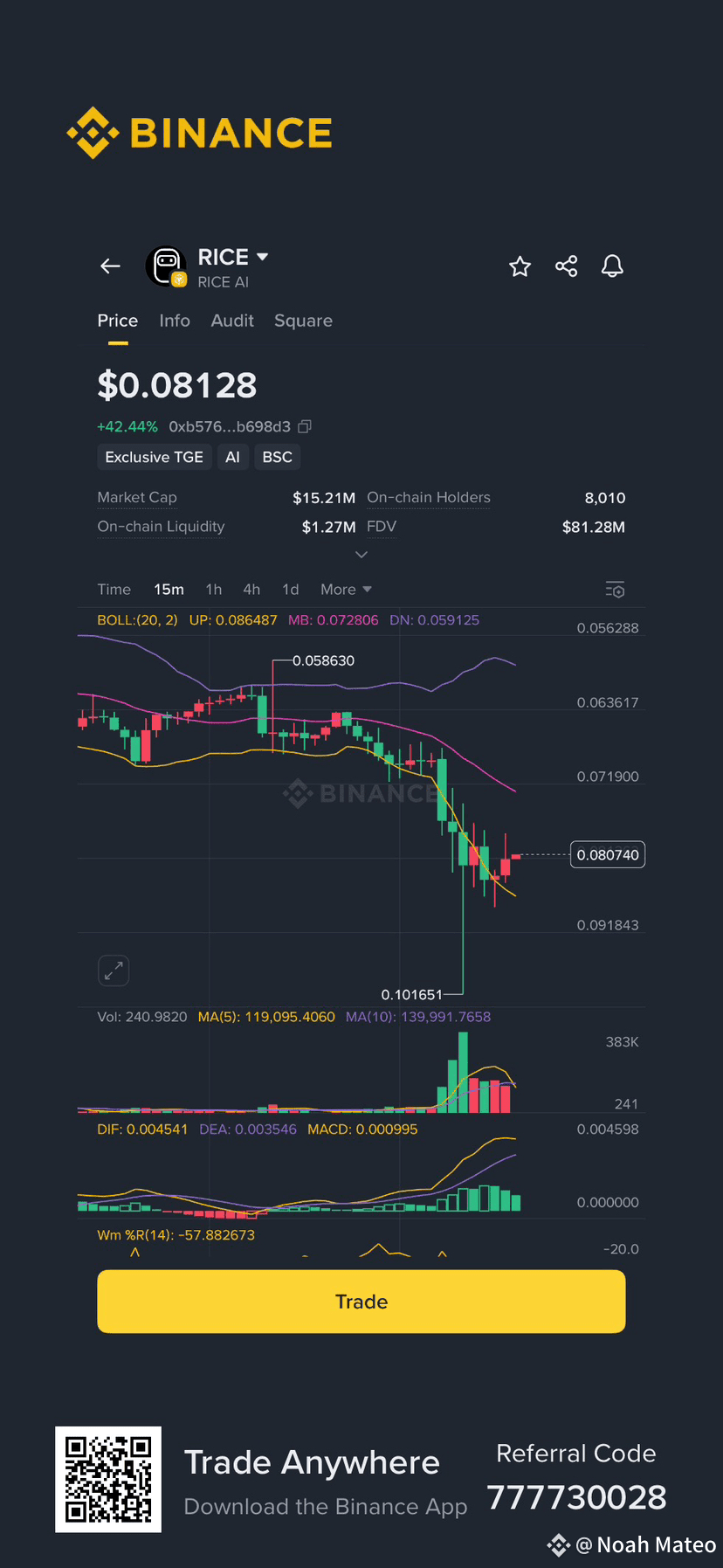 As per the latest data, the RICE AI token is experiencing a major surge, currently trading at $0.08128. This represents a massive +42.44% increase in just the last 24 hours, signaling a powerful bullish sentiment in the market. The token’s market capitalization stands at $15.21 million, supported by an on-chain liquidity of $1.27 million, which is more than sufficient for active trading. A key indicator of a healthy project is its community, and RICE AI boasts a growing number of 8,010 on-chain holders, reflecting increasing adoption and interest.