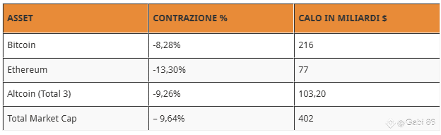 La Total Market Cap delle altcoin (TOTAL3), esclusi ETH e BTC, registra a sua volta una perdita del 9,26%. Nel confronto singolo, osservando BTC ed ETH, si nota che Bitcoin mostra una contrazione della propria capitalizzazione dell’8,26% mentre quella di Ethereum è più marcata, pari al 13%.