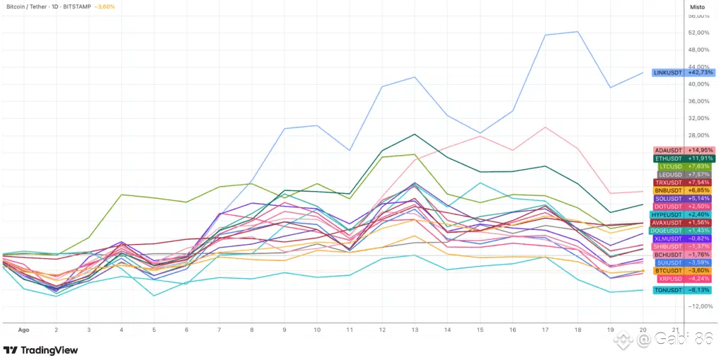 Nel grafico allegato, si può osservare come spicca Chainlink (recentemente analizzato) che mantiene un guadagno del +42% su base mensile. Ethereum resta in verde con un +12%, mentre Bitcoin perde il -3,60% e Ripple il -4,25%.