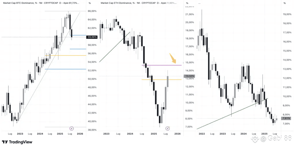 La fase di contrazione del mercato in corso sembra più favorevole a Bitcoin, tuttavia a livello della sua dominance nell’analisi del 10 agosto, avevamo segnalato l’importanza del breakdown del livello del 60%. La perdita di questo livello potrebbe portare a una maggior discesa di BTC rispetto a ETH, con un calo della dominance di BTC verso il 57%.