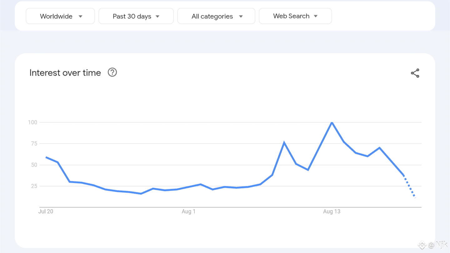 Public interest in Altseason has plunged by more than 55% in just one week, according to fresh Google Trends data. Search scores for the term dropped from 100 on August 13 to near 45 by August 20 — with some trackers showing an even steeper fall to 18 globally.