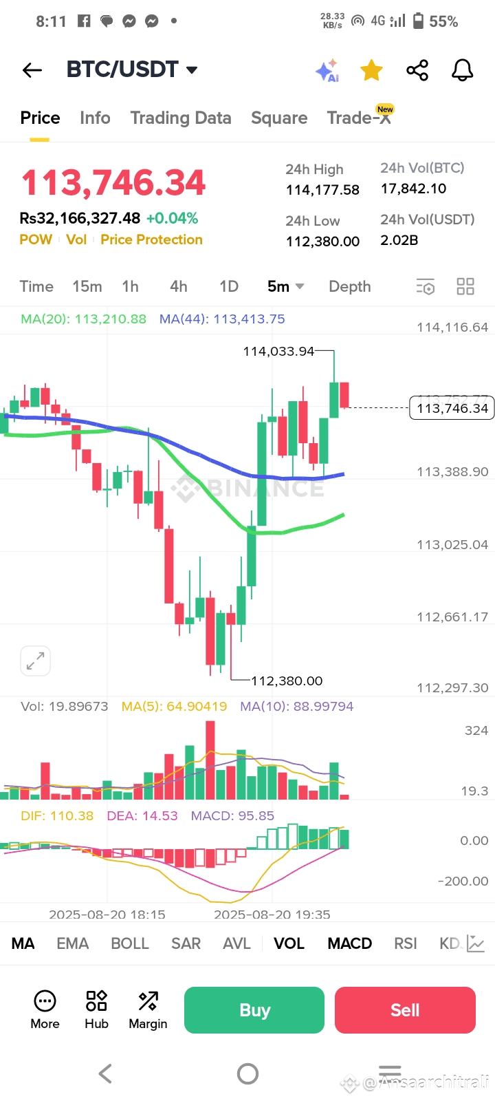 Traders, I owe you a candid reflection—last week’s SOL prediction fell short, and I’m committed to delivering sharper analysis. Let’s turn our attention to BTC/USDT. As of 8:11 PM PKT on August 20, 2025, Bitcoin is at $113,746.34, showing a +0.04% gain (Rs32,166,327.48) with a 24h volume of 2.02B USDT. After dipping to $112,380.00, the market is at a crossroads. Here’s a professional breakdown for the week ahead (August 20 - August 27, 2025).