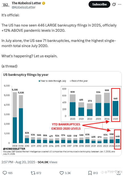 The United States has seen a dramatic surge in corporate bankruptcies in the first seven months of 2025. According to Kobeissi Letter and S&P Global Market Intelligence, there were 446 bankruptcy filings by large companies, marking the highest figure since 2010 and a 12% increase compared to the Covid-19 pandemic peak.