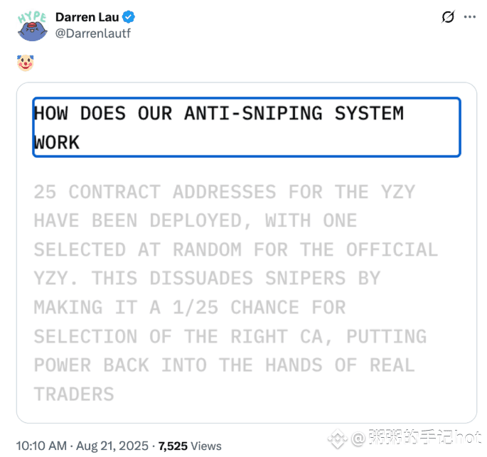 据 YZY Money 官网,为防“狙击”,团队设置了 25 个合约地址,并随机选出一个作为最终认证地址,使提前猜中正确地址的概率降至 4%。