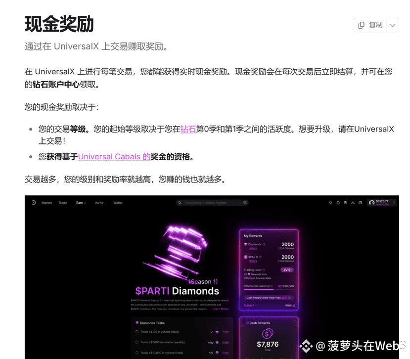 Diamonds 钻石:每次交易都会实时获得,可兑换 PARTI 或其他福利