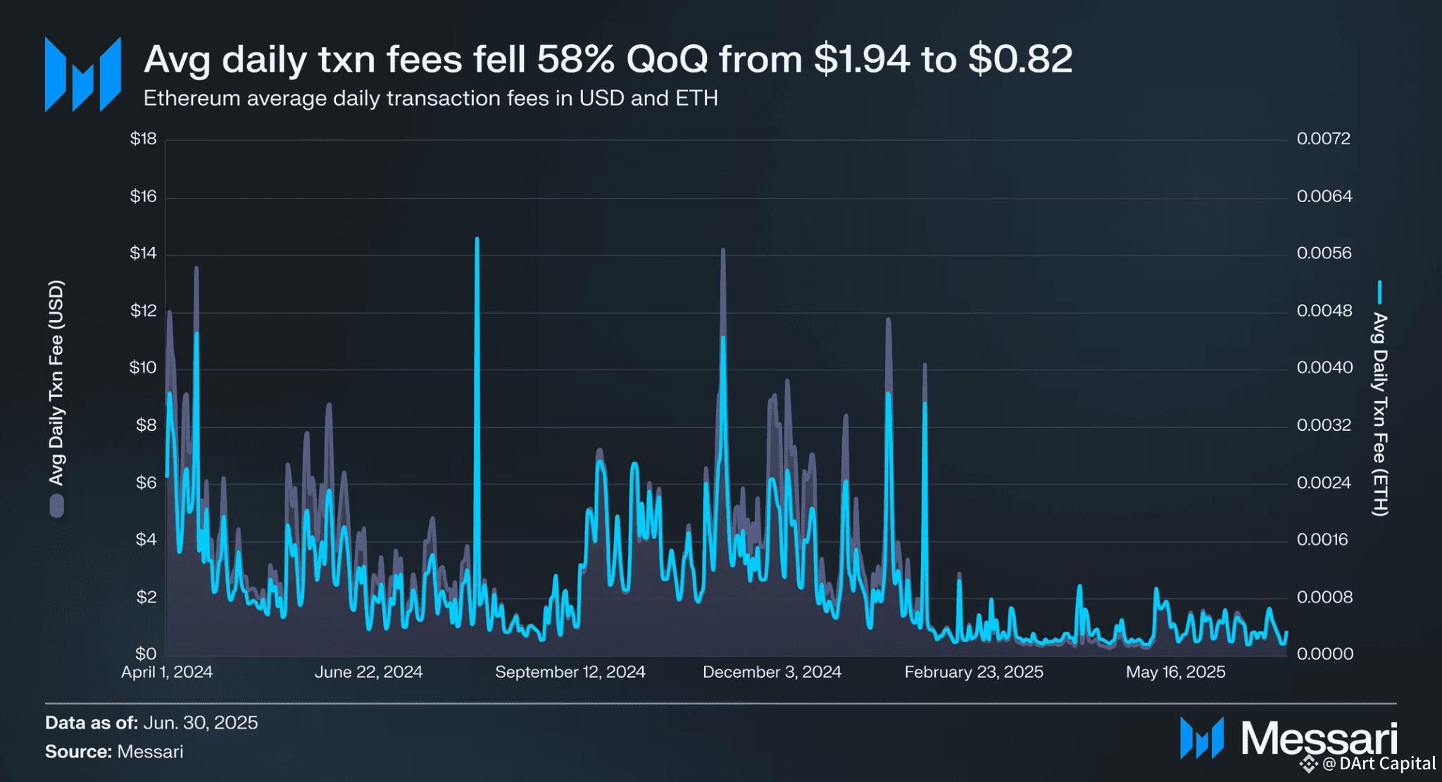 Kabar terbaru dari jaringan Ethereum menarik perhatian banyak orang. Berdasarkan data dari Messari, rata-rata biaya transaksi harian di jaringan Ethereum telah mengalami penurunan drastis, anjlok hingga 58% secara kuartalan (QoQ), dari $1,94 menjadi hanya $0,82.