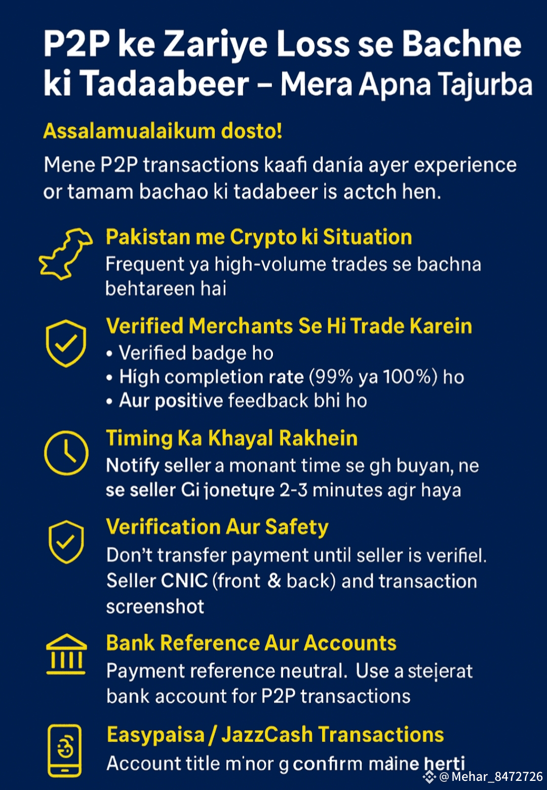 *For every transaction: Save the seller's CNIC (front & back) picture Keep the transaction screenshot And always use the same name bank account which is registered on the Binance account All this will help you a lot in case of dispute.