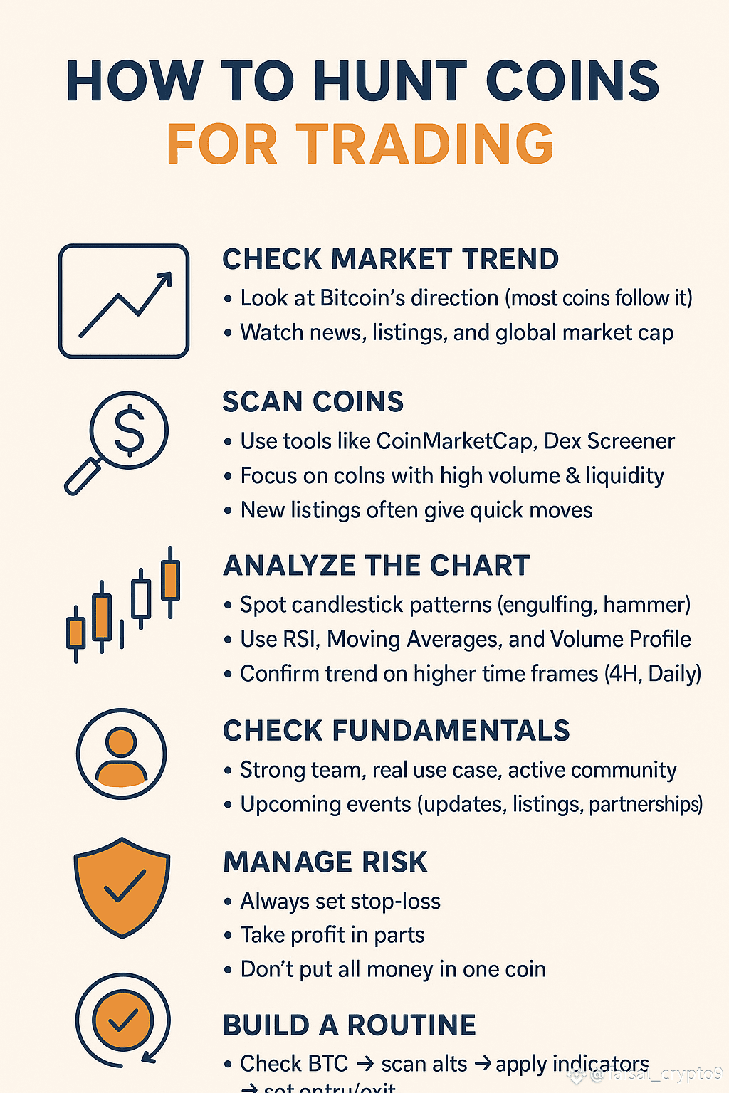 Hunting coins for trading means finding tokens with strong potential before making a move. Here’s how to do it: