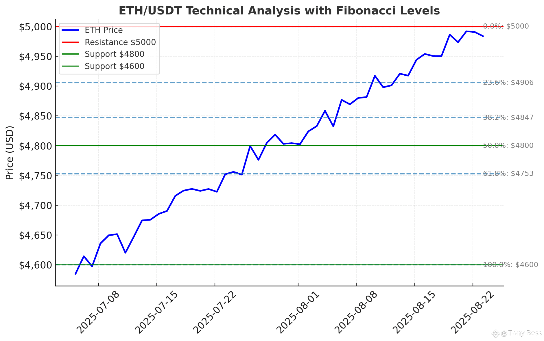 If ETH breaks and sustains above $5,000, the next leg higher could target $5,300–$5,400. However, failure to hold above $4,800 may lead to a short-term pullback toward $4,600.