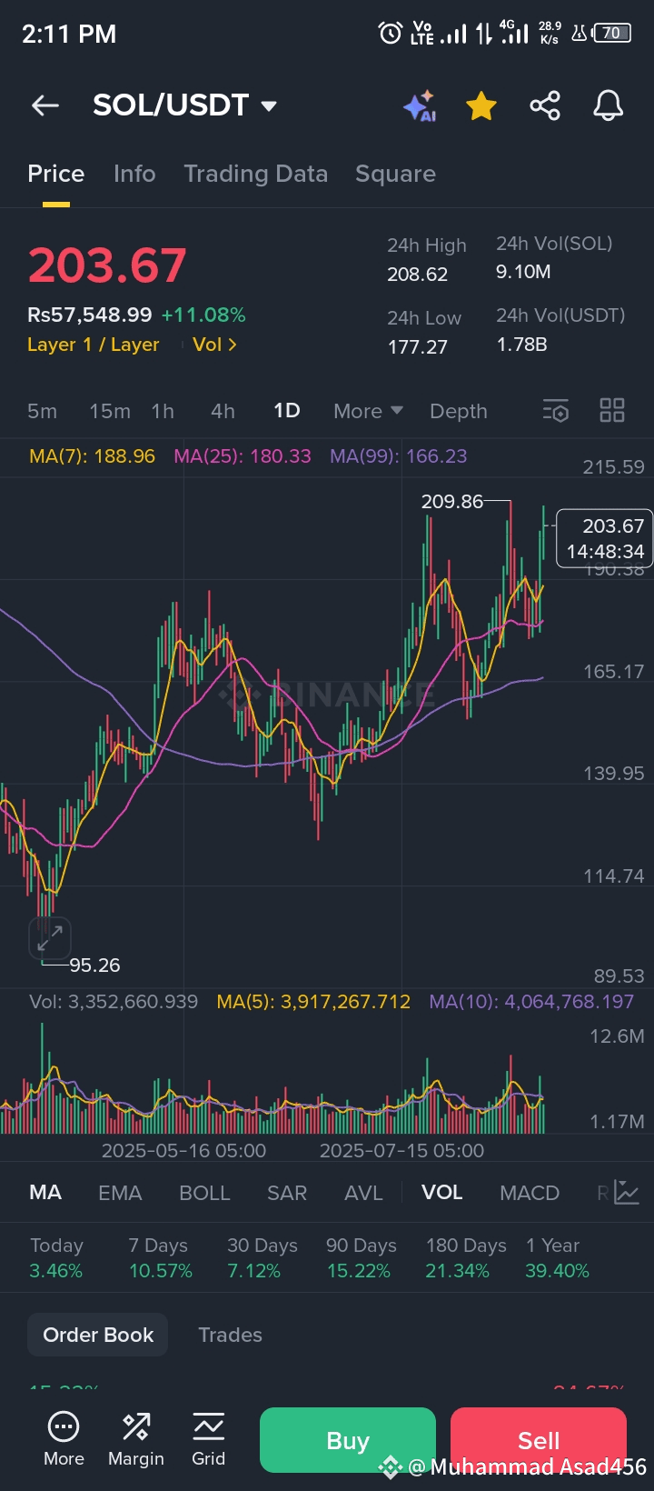 The SOL/USDT pair is showing strong bullish momentum, trading at **203.67 USDT**, up **+11.08%** in the last 24 hours. With a 24-hour high of **208.62** and solid volume backing the move, SOL continues to outperform in the Layer 1 segment. Here’s a detailed analysis for your next trade: