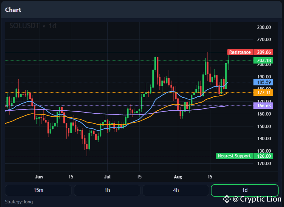 The big picture for SOL remains bullish. The critical daily moving averages are stacked bullishly (20 > 50 > 200), which is a classic sign of a healthy uptrend. This isn’t just a short-term pump; it’s a sustained trend providing solid support. Adding to this, the MACD—a key momentum indicator—is also bullish and has been for some time, confirming that buyers are in control.