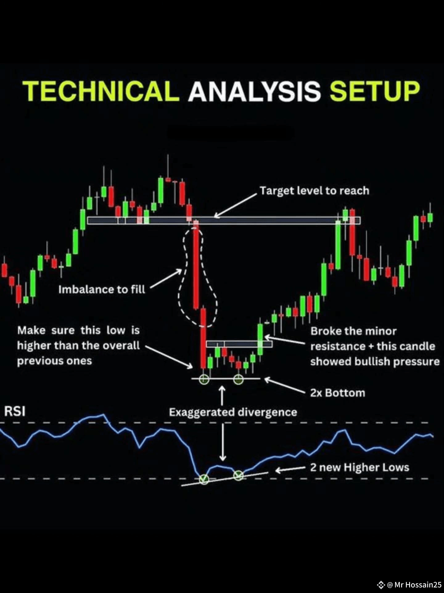 Exaggerated Divergence: The chart points out an "Exaggerated divergence" between the price and the RSI. While the price forms a "2x Bottom" (two lows at a similar level), the RSI forms "2 new Higher Lows."