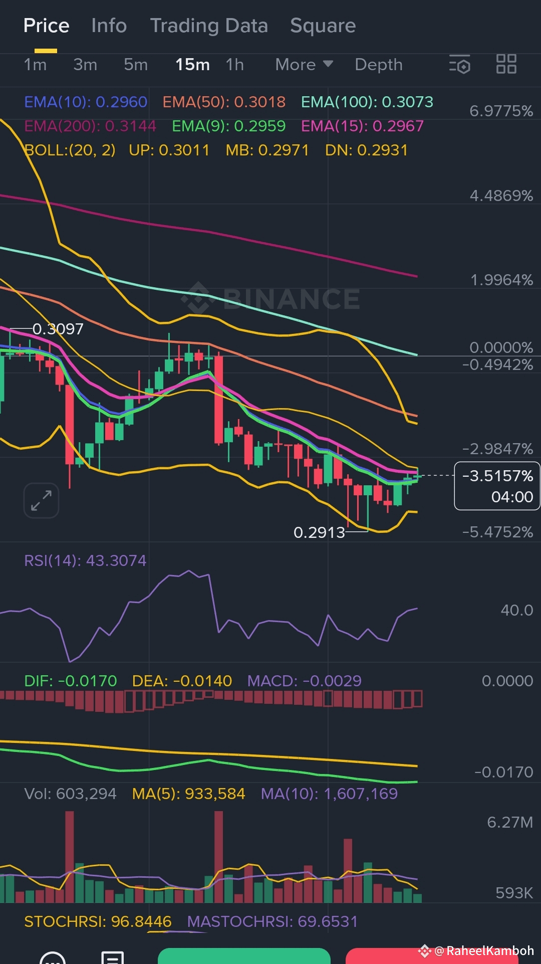 · The Story: Price is trading AT or BELOW all major EMAs. The trend is bearish, no doubt. But look at the Bollinger Bands! Price is pressing the LOWER BAND ($0.290 - $0.293). This is a classic support zone where bounces are born.