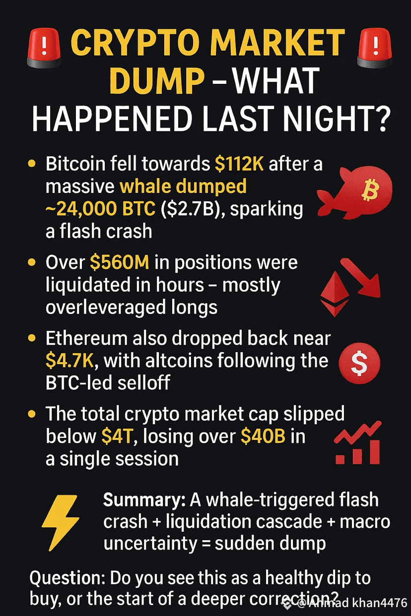 • A massive Bitcoin whale dumped 24,000 BTC, valued at roughly $2.7 billion, triggering a flash crash that dragged prices sharply lower and caused hundreds of millions in leveraged liquidations.