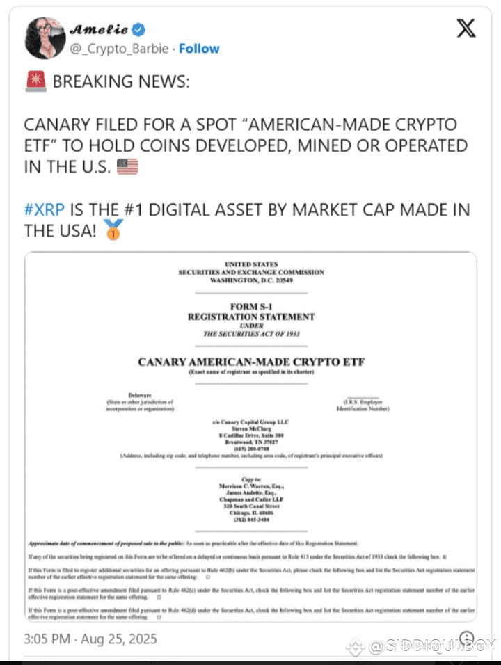$XRP Crypto influencer Amelie reported that Canary has submitted a Form S-1 registration statement with the U.S. Securities and Exchange Commission for a spot exchange-traded fund named the “Canary American-Made Crypto ETF.”