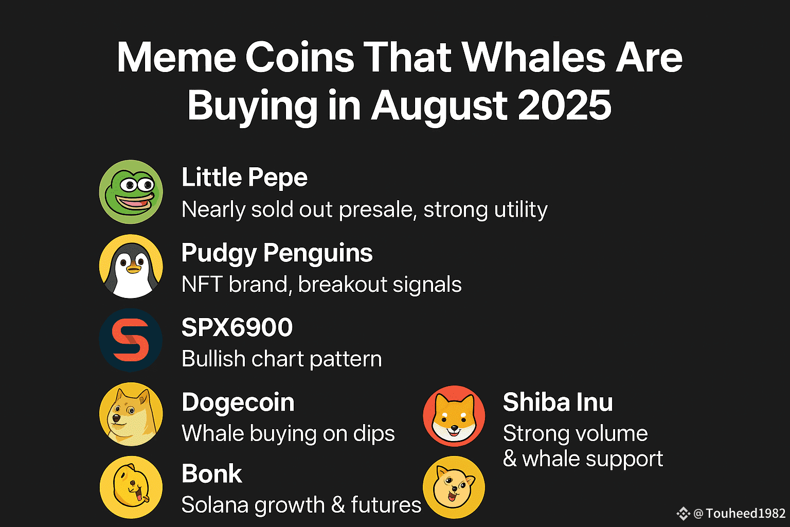 In August 2025, big investors (also called whales) are buying some meme coins in large amounts. This shows which coins have strong demand and possible growth. Here are the top 6 meme coins: