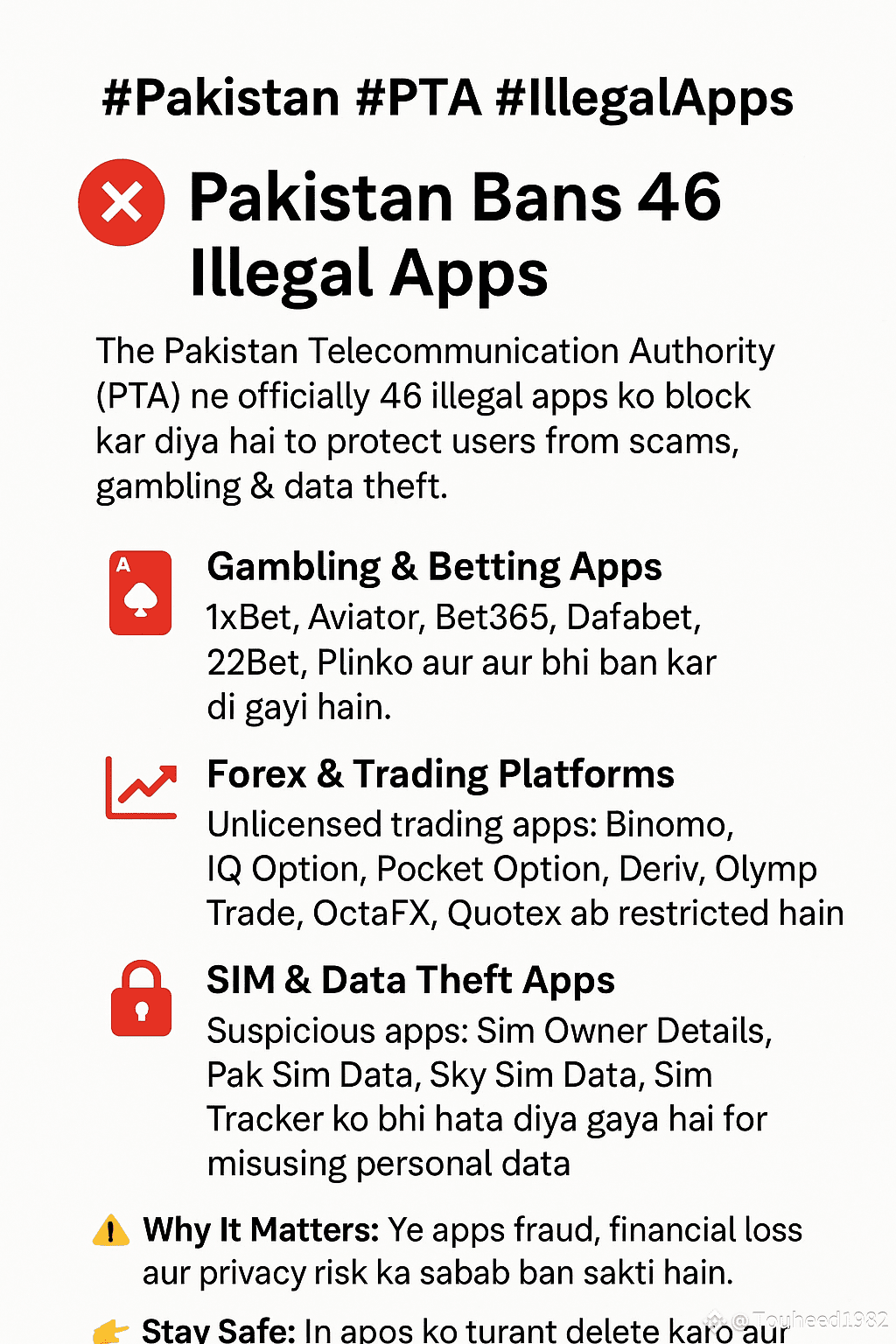 Pakistan Telecommunication Authority (PTA) ne 46 apps ko block kar diya hai jo users ke liye scams, gambling aur data theft ka risk ban rahi thi. 🚫