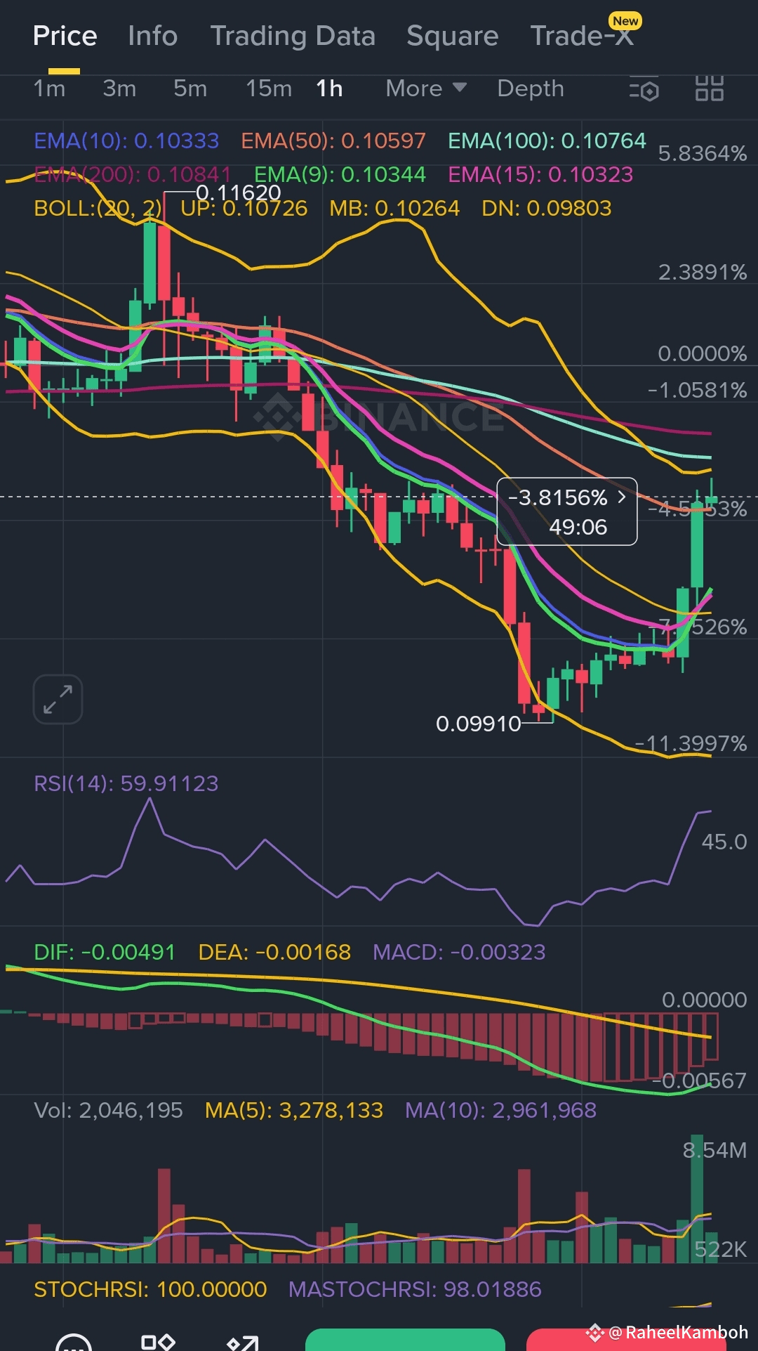 · EMA(200): 0.10861 - Long-term trend is still bearish.