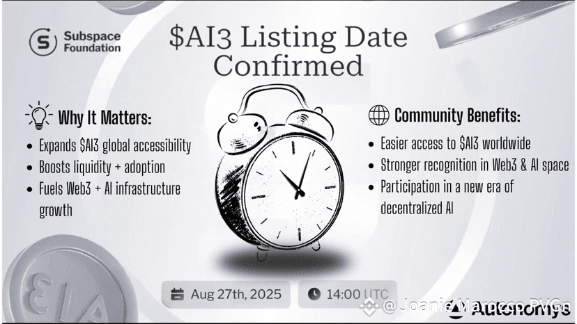 The upcoming exchange listings for @AutonomysNet native token $AI3 mark a historic milestone for the network and its growing community. With centralized exchange (CEX) onboarding now nearly complete, #AI3 is set to make its debut on August 27 at 14:00 UTC.