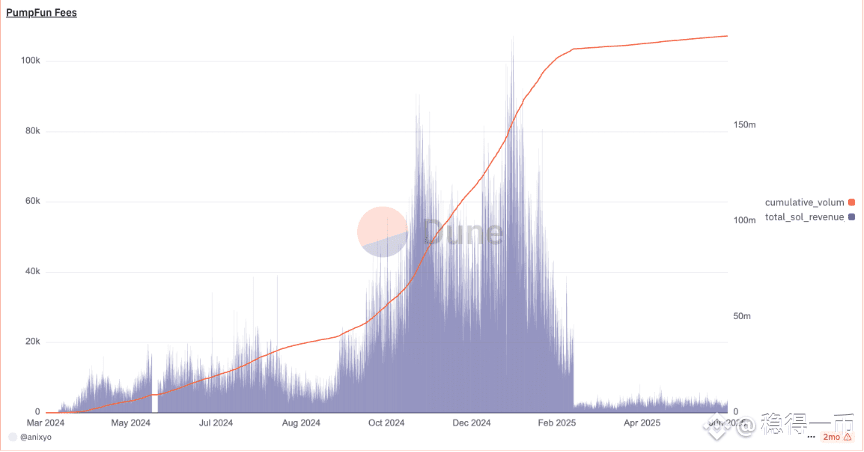 数据上看,比特币和以太坊等主流币重新巩固了主导地位:2022年比特币市值占比曾跌至约39%,而2023年均值回升到45.6%,2024年进一步升至51.9%,2025年迄今已接近59.3%。这意味着经历上一轮熊市洗礼后,资金更倾向流向比特币、以太坊等头部资产。与之相对,长尾的山寨币和Memecoin虽在局部掀起浪花,但整体增长乏力。例如2023年第二季度掀起的Pepe等Memecoin热潮使Pepecoin市值一度飙升至约15亿美元高峰,但此后迅速回落到7亿美元以下;2024年底的meme发射平台pumpfun曽一度金狗倍出,平台手续费收入超过Tier2交易所,但随着市场理性回归目前手续费已降低至最高点的5%。