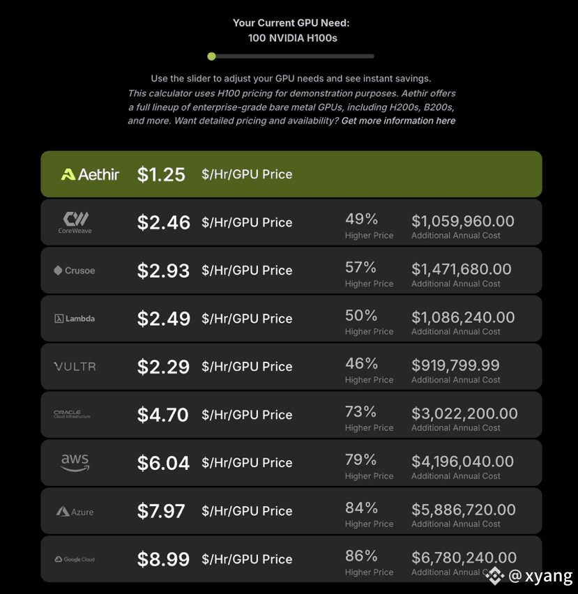 同样是 NVIDIA H100 GPU,Aethir 只需 $1.25/小时,而 Google Cloud 却高达 $8.99/小时,成本差距高达 86%。