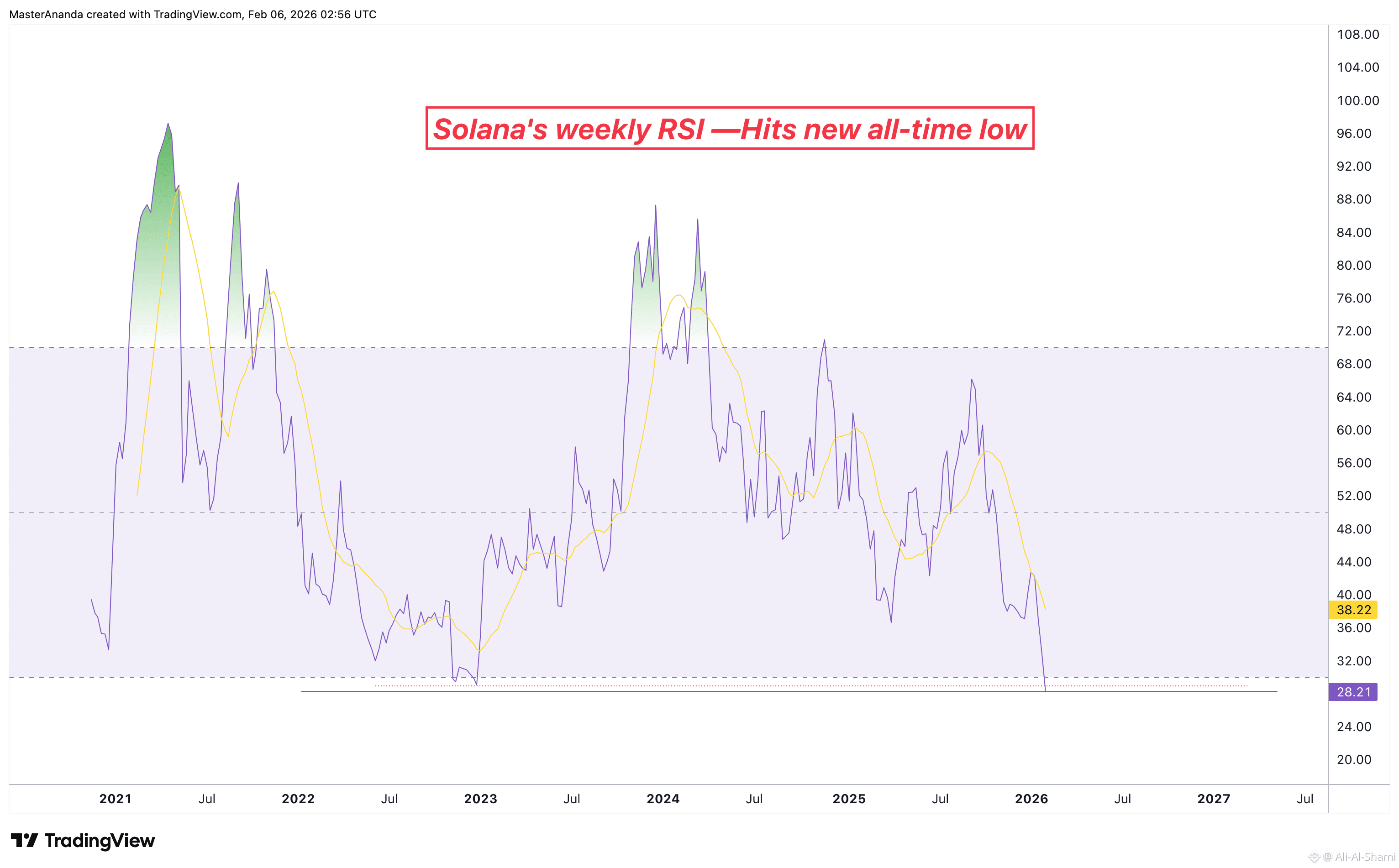 هذه هي نفس الإشارة التي لدينا اليوم. سولانا انخفضت حتى أقل على مؤشر RSI الأسبوعي وهذا يمنحنا حالة مفرطة البيع بشكل كبير.