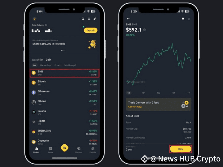 Click on the cryptocurrency you want to buy. Let's say you want to buy BNB. Click on BNB, a page will appear on which you will see a simple BNB trend chart, the current price, and coin specifics.