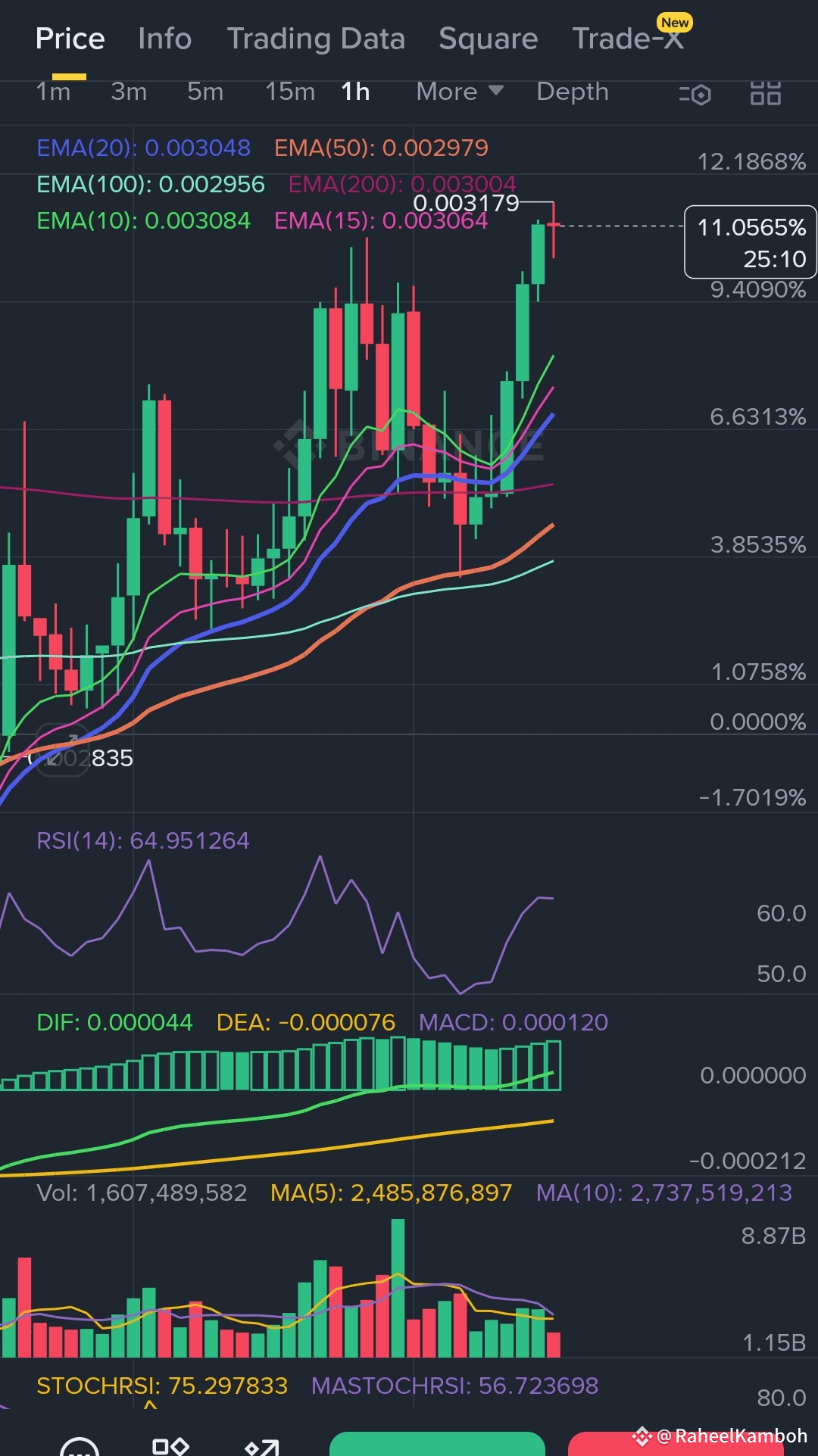 🧲 KEY MOVING Averages: The price is trading decisively ABOVE all key EMAs(20, 50, 100, 200). This is a textbook BULLISH ALIGNMENT. The EMAs are now acting as a strong support ladder. Any pullback will likely find buyers at the EMA(20) around $0.00310.