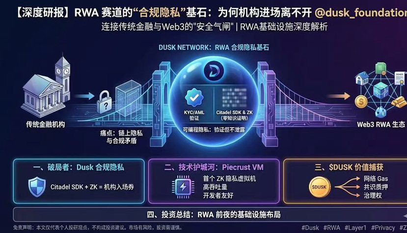 Dusk 不仅仅是一个隐私项目,它更像是 Web3 世界与传统金融体系之间的“安全气闸”。在 RWA 爆发的前夜,布局这样一个兼具技术壁垒与合规叙事的标的,盈亏比极佳。