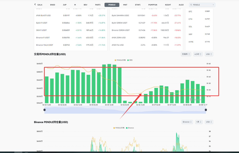 • 背离形态: 在最近 48 小时内,PENDLE 价格维持在 1.15 - 1.18 的窄幅震荡区间,甚至有阴跌迹象。然而,合约持仓量 却逆势上涨,创出近期新高。