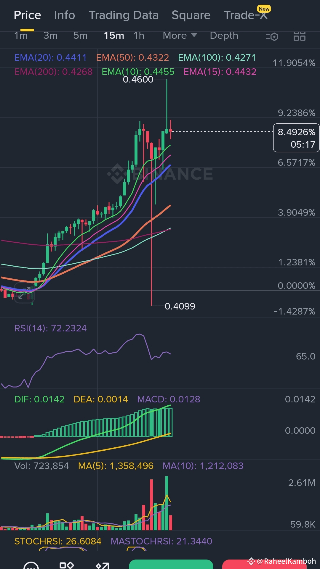 · Wait for a 15m candle to close ABOVE $0.450 with increasing volume.