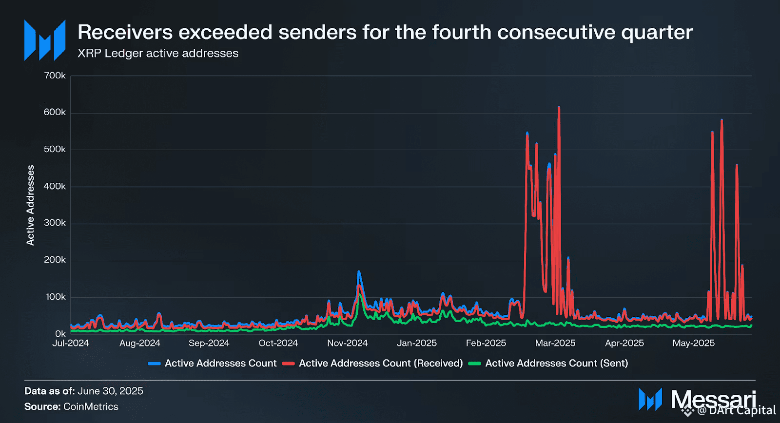 Grafik ini membandingkan jumlah alamat aktif yang mengirim uang dengan yang menerima uang di XRP Ledger.