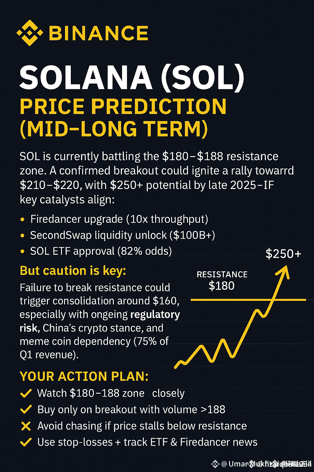 SOL is currently testing the $180–$188 resistance zone. A confirmed breakout could spark a rally toward $210–$220, with $250+ potential by late 2025 if key catalysts align: