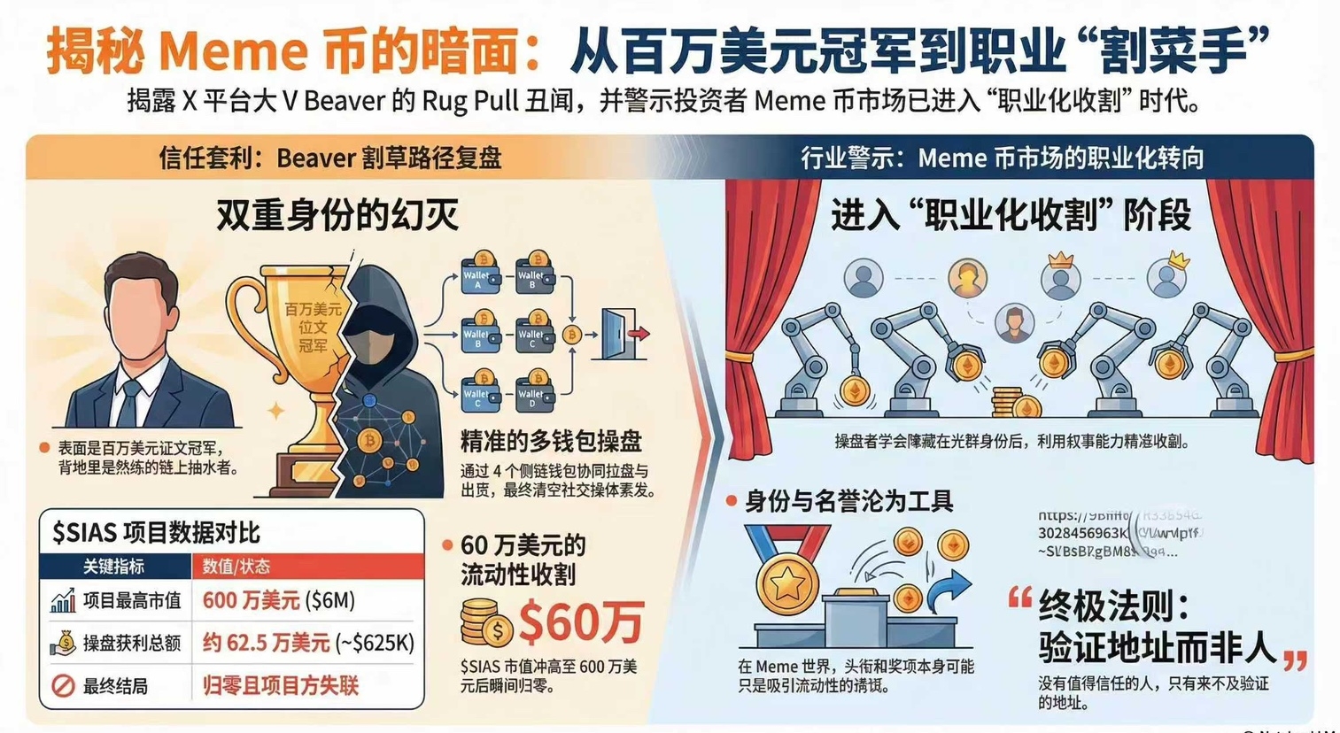 这起事件最终会不会引发平台层面的回应,还未可知。但它已经留下了一个极其清晰的信号:2026 年的 Meme 币市场,正在从“草根狂欢”进入“职业化收割”阶段。操盘者更懂叙事,更懂节奏,也更懂如何隐藏在光鲜身份背后。
